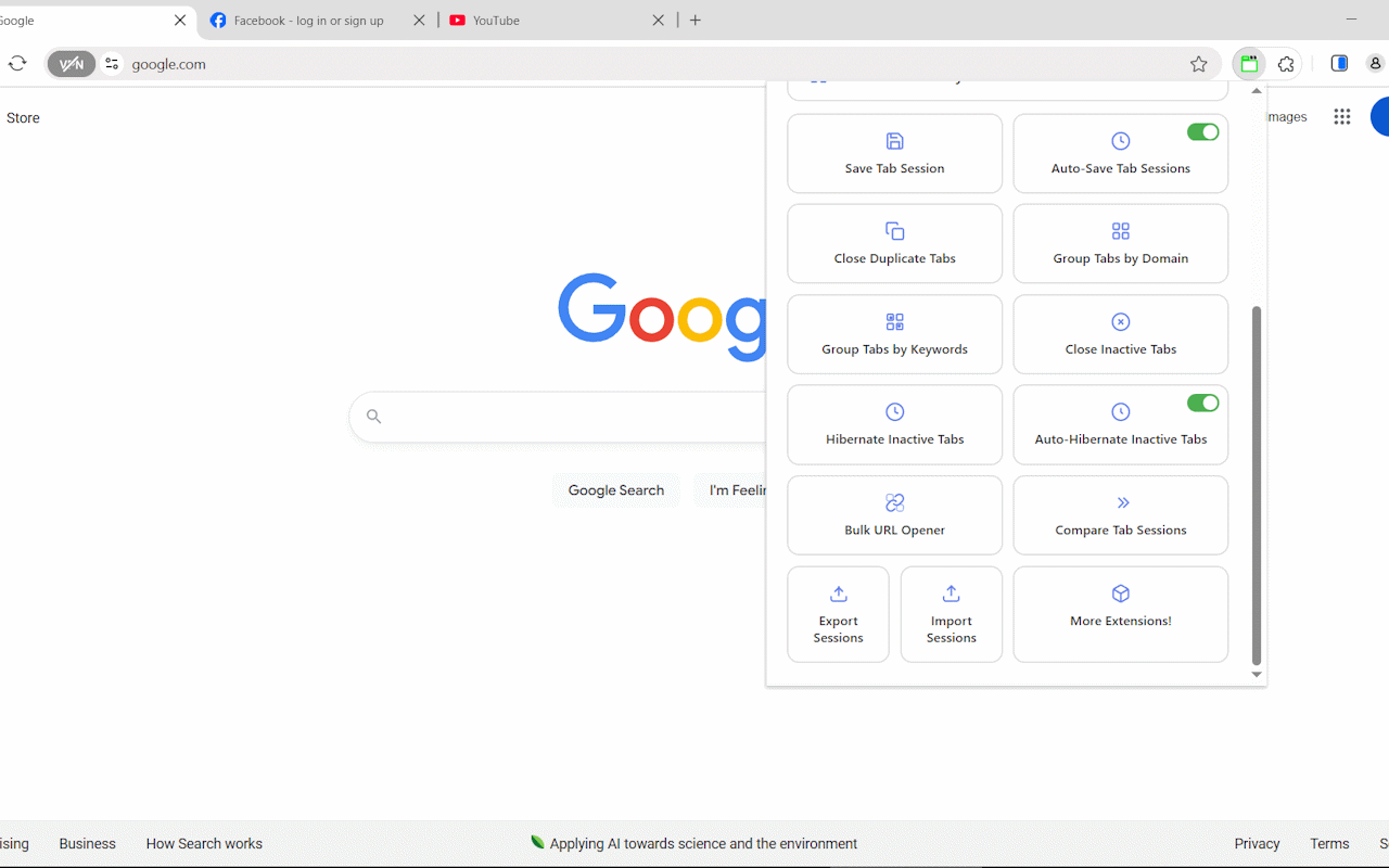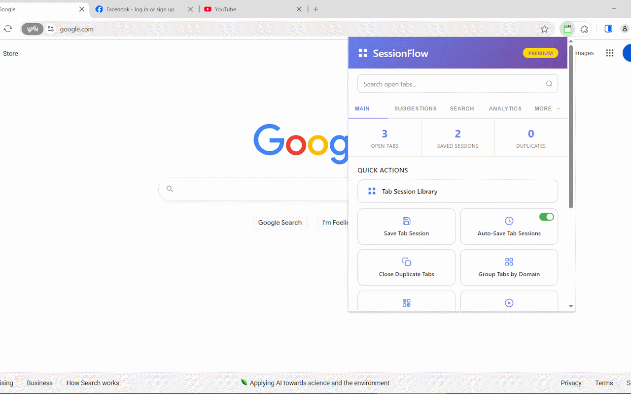 Find any open tab instantly with SessionFlow’s powerful search functionality. The global search feature scans across all browser windows, searching tab titles, URLs, and domains simultaneously. Advanced filtering options help locate specific content types, while smart suggestions guide you to relevant tabs based on browsing patterns. The search system understands context, prioritizing recently accessed tabs and frequently visited domains. Navigate massive tab collections effortlessly, eliminate the frustration of hunting through dozens of open tabs, and maintain perfect awareness of your browsing landscape regardless of session complexity.