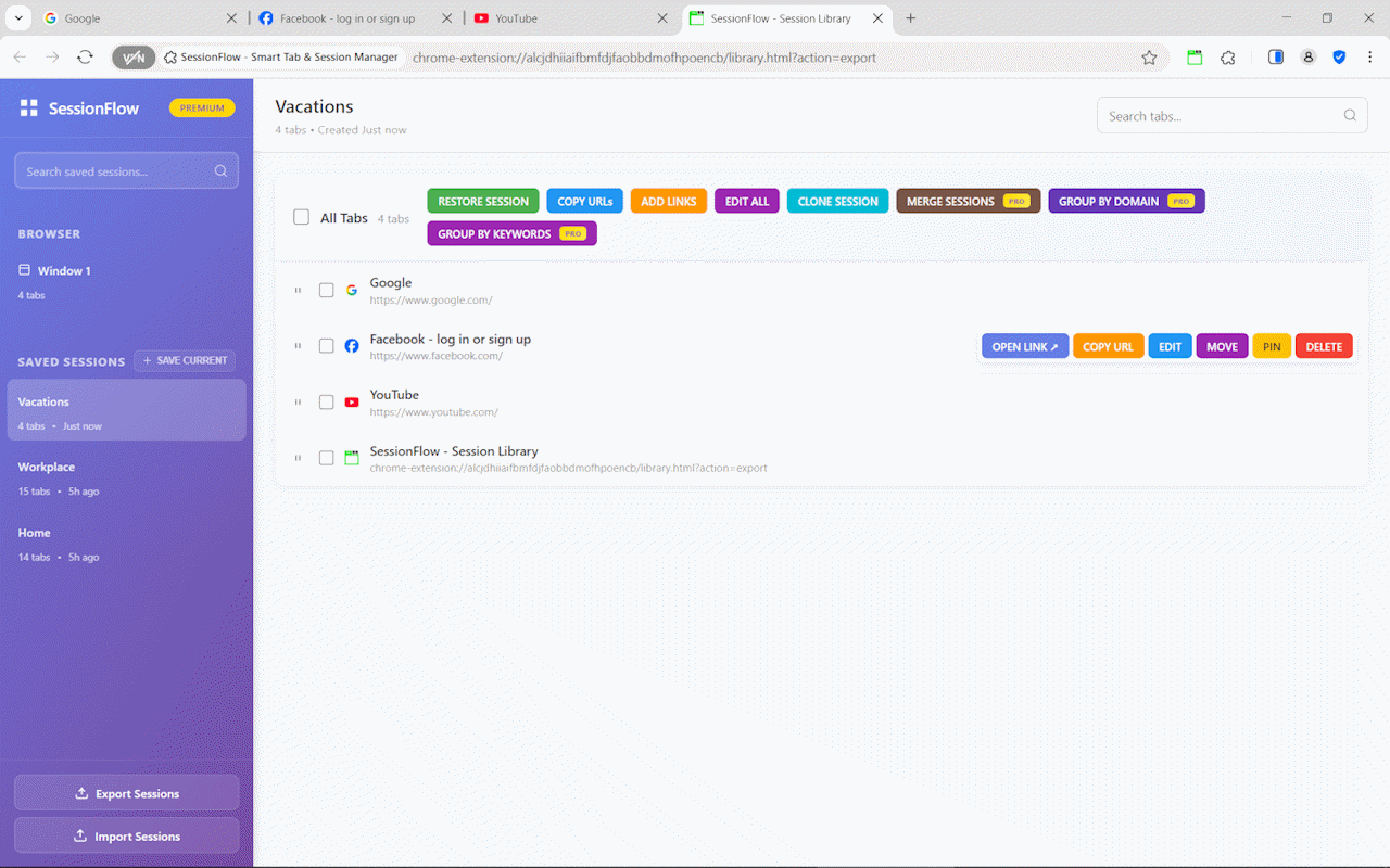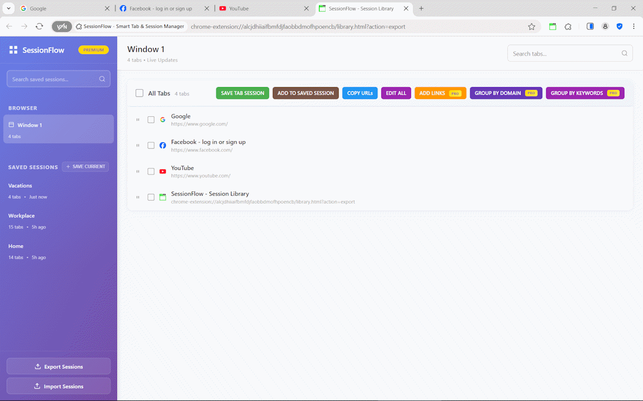 SessionFlow transforms your browser chaos into an organized, productive workspace. This professional-grade Chrome extension eliminates tab clutter while preserving your browsing sessions with military precision. Whether you’re juggling multiple projects, conducting research, or managing daily workflows, SessionFlow provides the organizational backbone your browsing needs. Save unlimited tab sessions, restore complete workspaces instantly, and never lose important browser states again. The extension captures everything: tab groups, pinned tabs, favicon data, and window arrangements, ensuring perfect session reconstruction every time.