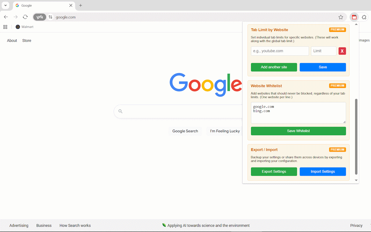 Premium users gain access to granular site-specific tab management, allowing unprecedented control over different websites. Set custom limits for social media platforms like YouTube or Facebook while maintaining unlimited access to work-related sites. The system supports both exact domain matching and intelligent subdomain detection, ensuring comprehensive coverage. For example, setting a limit for “youtube.com” automatically applies to “www.youtube.com” and “music.youtube.com.” This feature is perfect for maintaining work-life balance, limiting distracting websites during focused work sessions, or managing entertainment consumption. Create as many site-specific rules as needed, each with individual limits and behaviors tailored to your relationship with different online platforms.